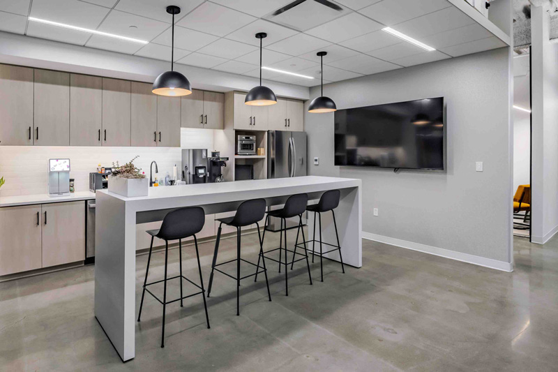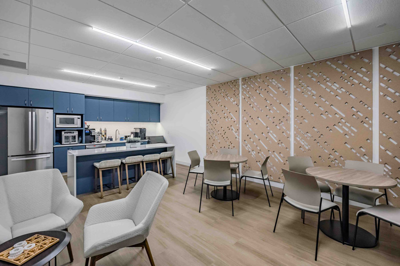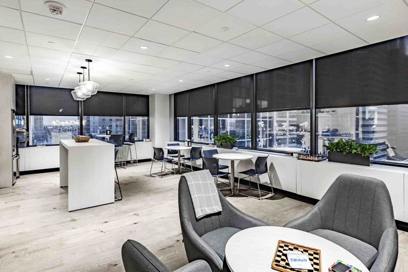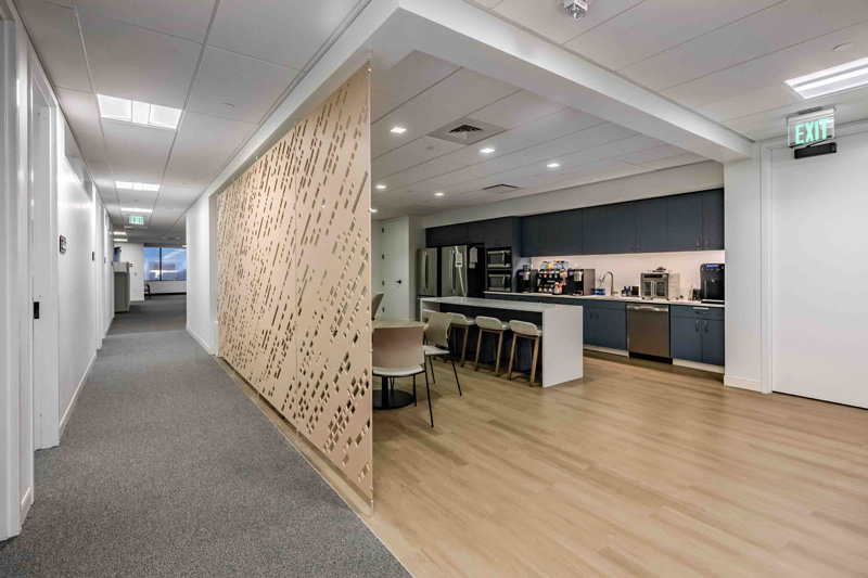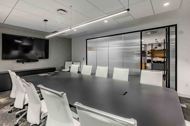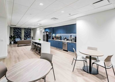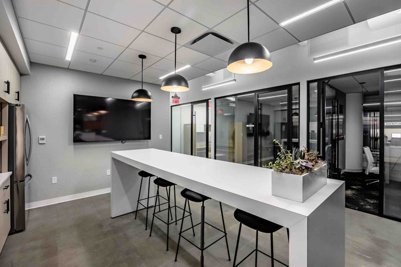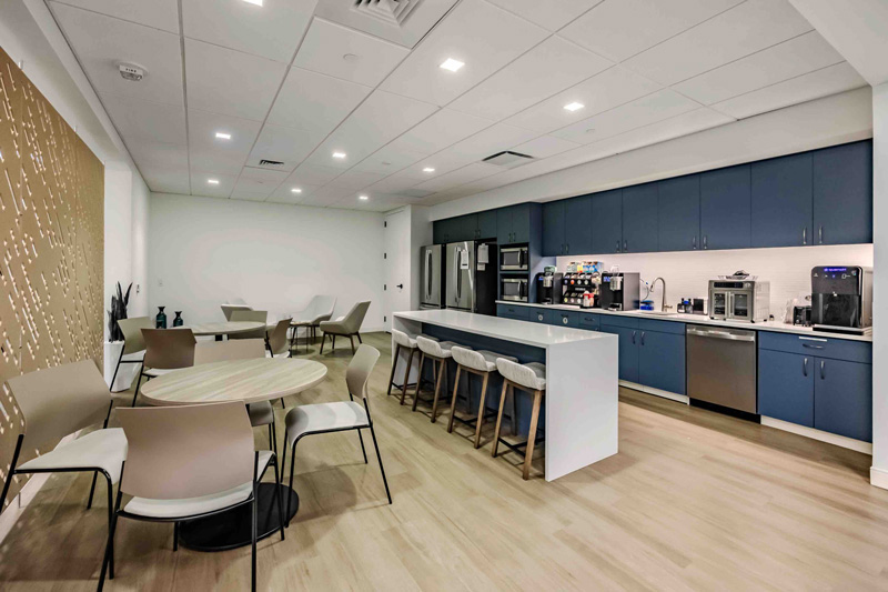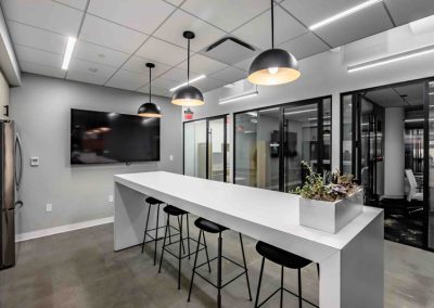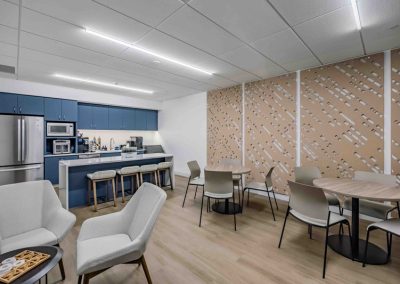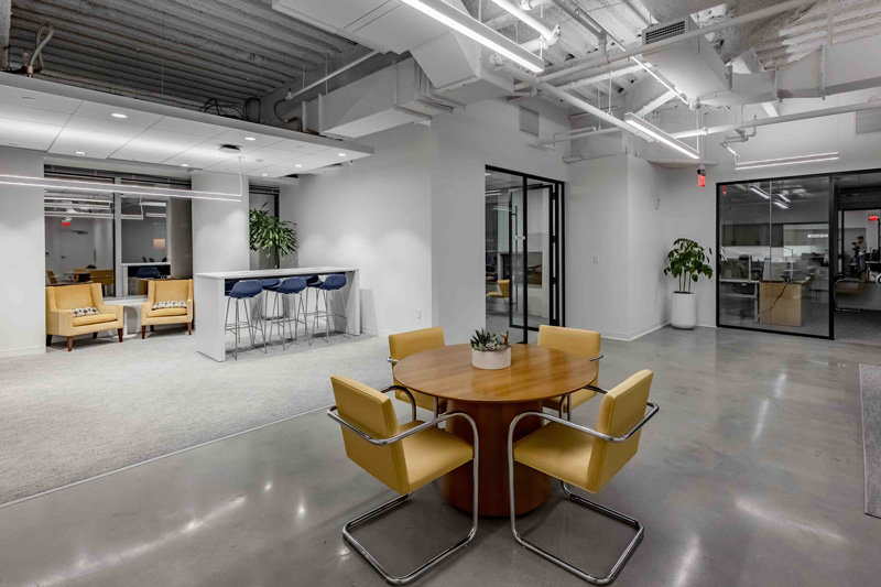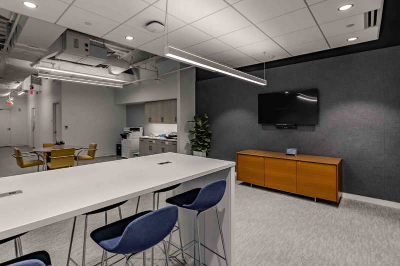 This project included a new concrete slab with a lounge area and hospitality kitchen service area. There were also four conference rooms with a co-working space. A cool, exposed painted ceiling with MDC Zintra suspended clouds and custom wallpaper completed the project, which is part of the 494,000 square feet, mixed-use development The Hamilton.