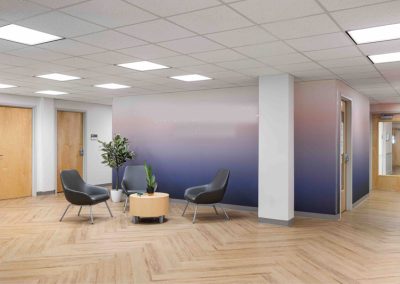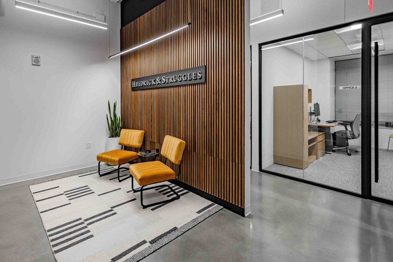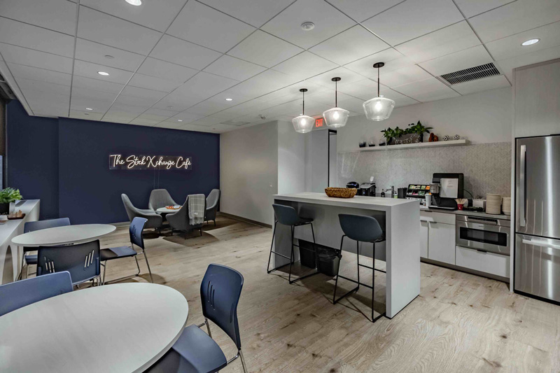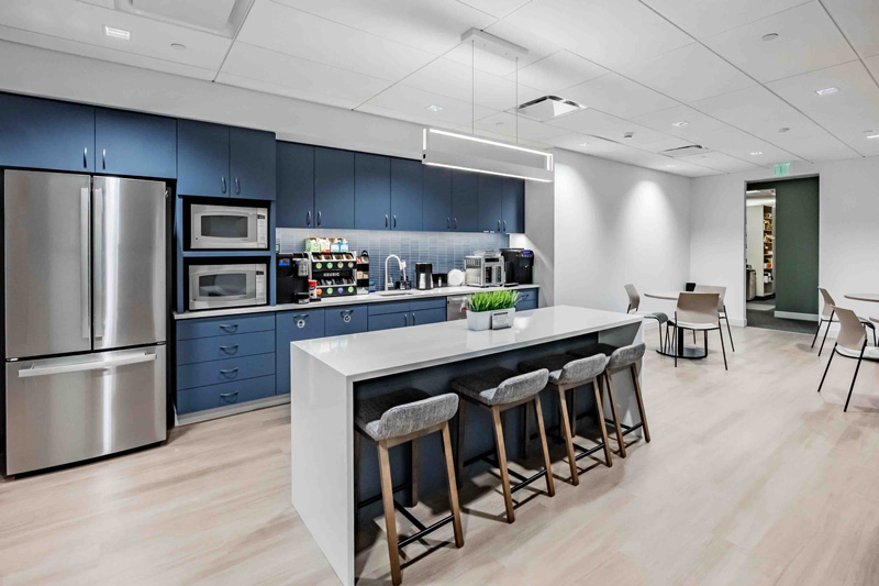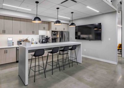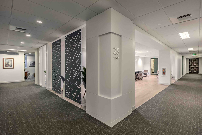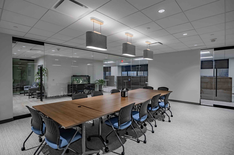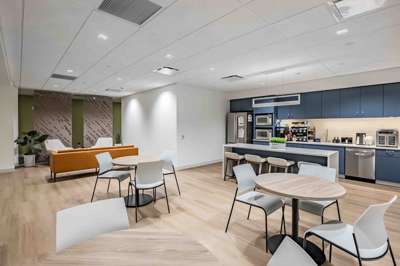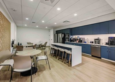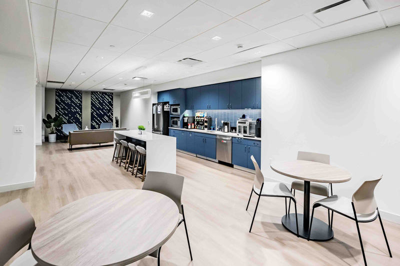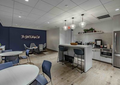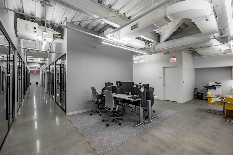 This project included a new concrete slab with a lounge area and hospitality kitchen service area. There were also four conference rooms with a co-working space. A cool, exposed painted ceiling with MDC Zintra suspended clouds and custom wallpaper completed the project, which is part of the 494,000 square feet, mixed-use development The Hamilton.