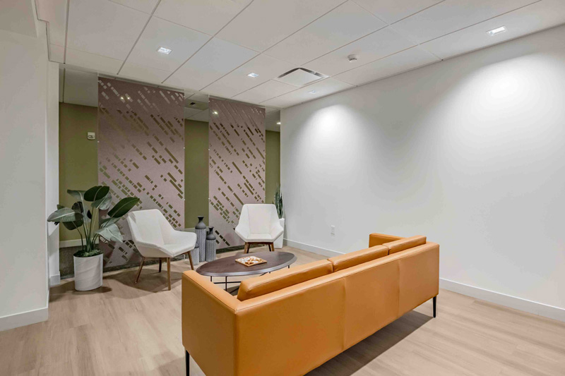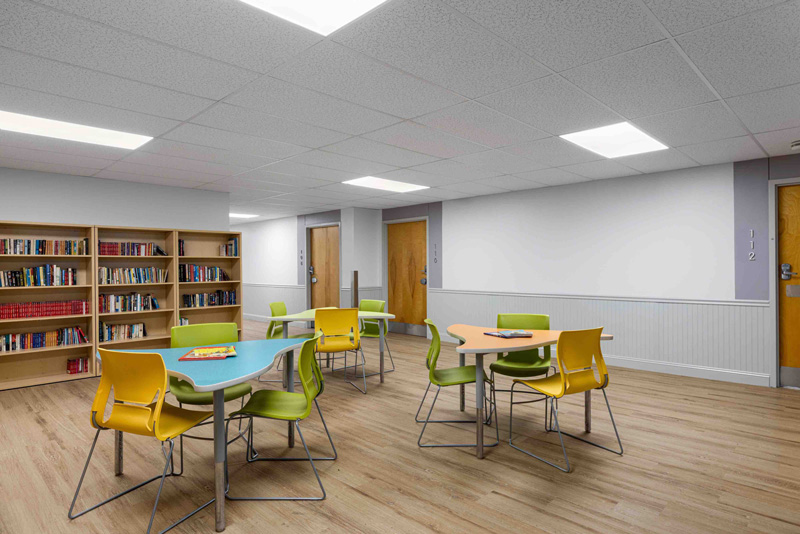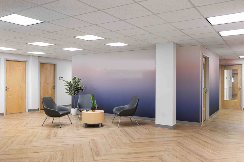 To make the space more inclusive for those with vision impairments, and help facilitate orientation and mobility for those individuals, color, floor textures, and delineation between sitting spaces and walking areas were all part of the scheme.
