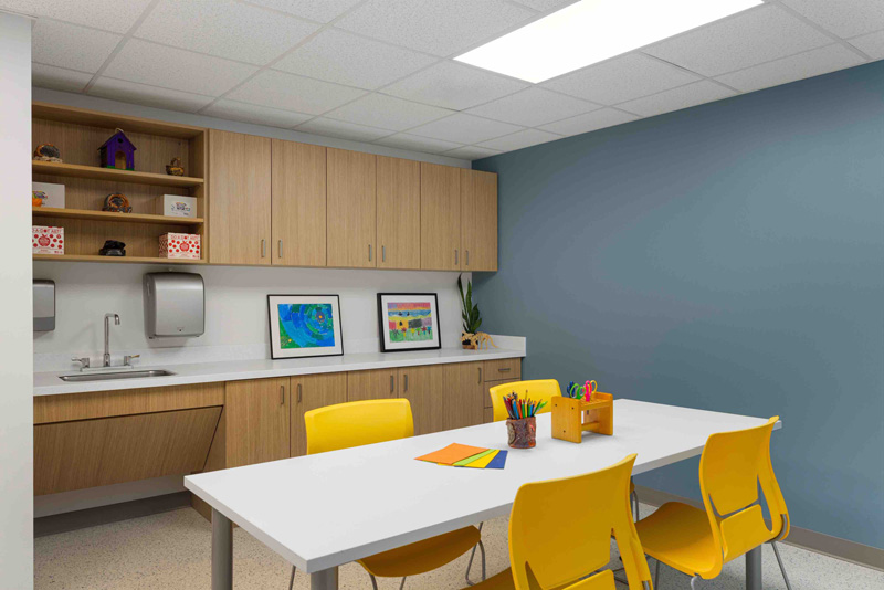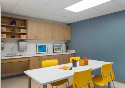 Located within the historic Curtis Center Building, the 10,000sf renovation project presented challenges due to the lower than usual deck height. Work included custom millwork using birch pole screening walls, custom maple plank walls and trim throughout as well as an indoor activity gym. The gym consisted of a sliding board, monkey bars, hiding areas and a rock climbing wall. Also within the scope of work were new restrooms, arts and crafts areas, classrooms and a food prep/lunchroom area.
