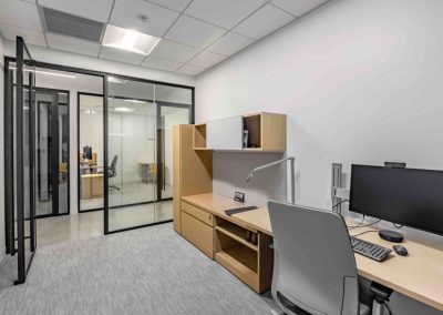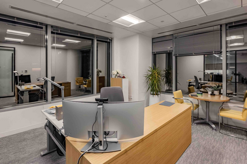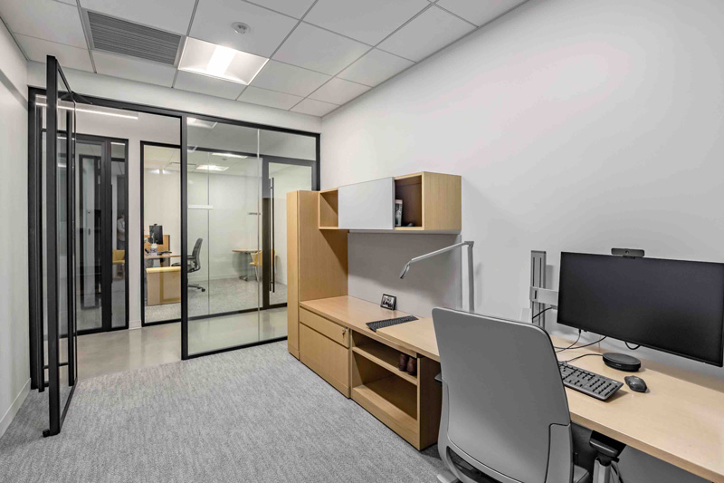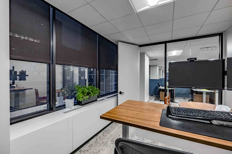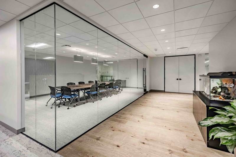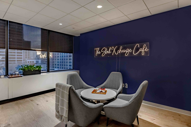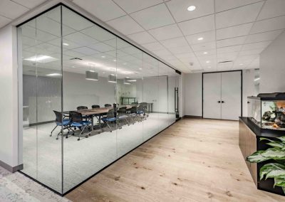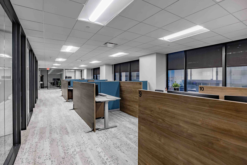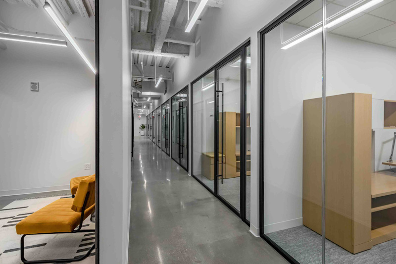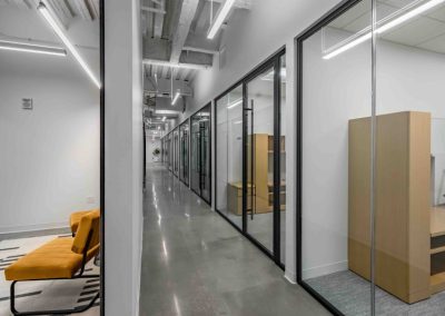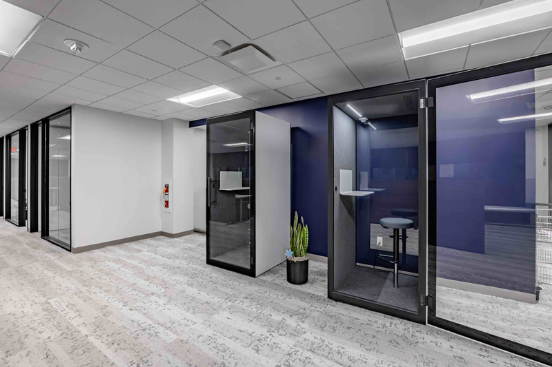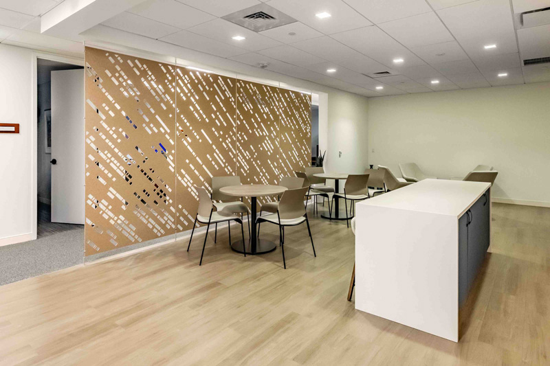 This complete renovation included creating private offices with glass fronts and doors, an upgraded open seating area, new restrooms, acoustic panels for sound dampening, and newly installed skylights. The architect for this project was Baglivo Associates.