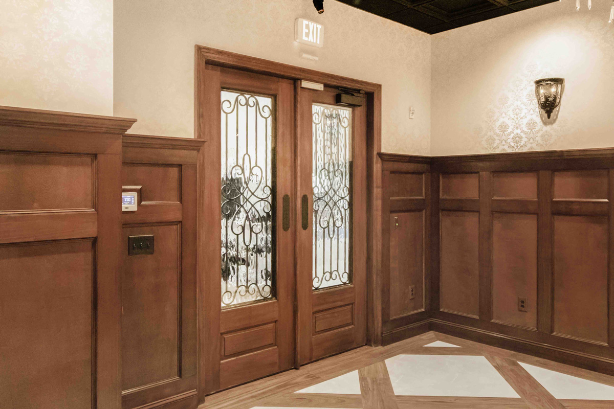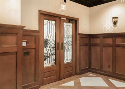 The front entrance, with double glass doors, issue an invitation of welcome allowing the wood panel doors to remain open. Church members and visitors then step into a foyer with beautifully restored wide plank floors.